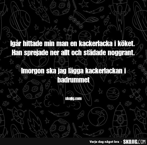 Igår hittade min man en kackerlacka i köket.